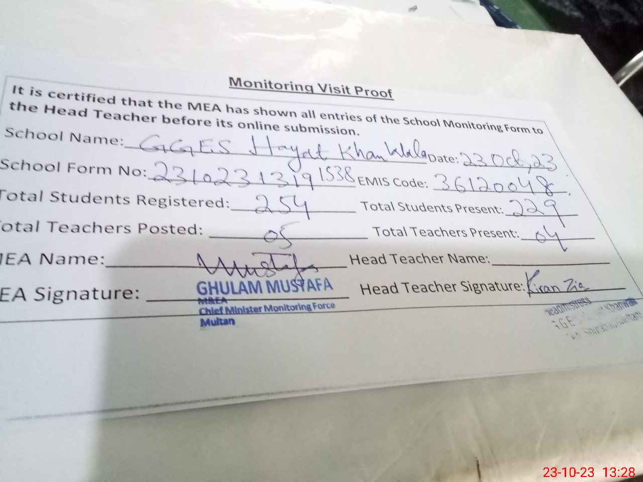 | Attendance Register | Head Teacher | MEA with School | Visit Proof |