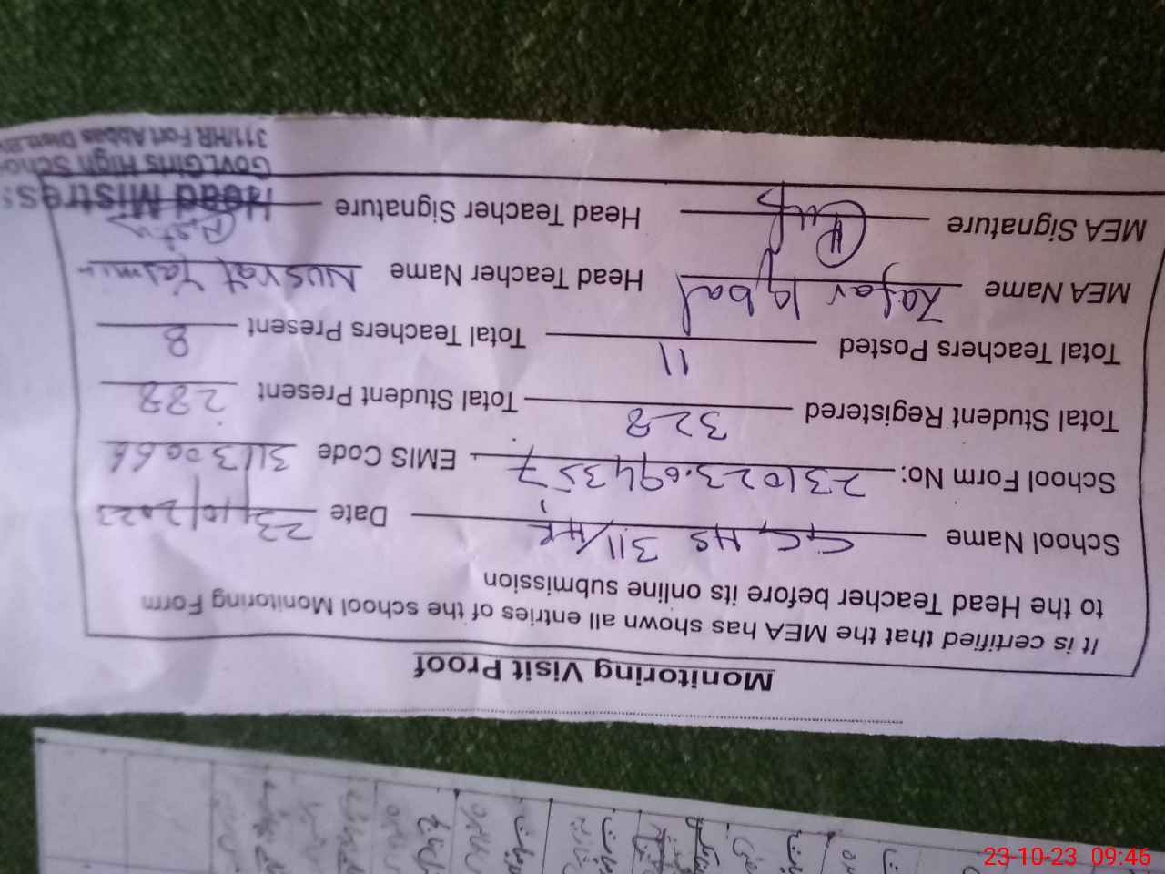 | Certified that this School was Inspected by the Undersigned MEA/DMO Today and the Information Stated Above is as Per Record. | |||||