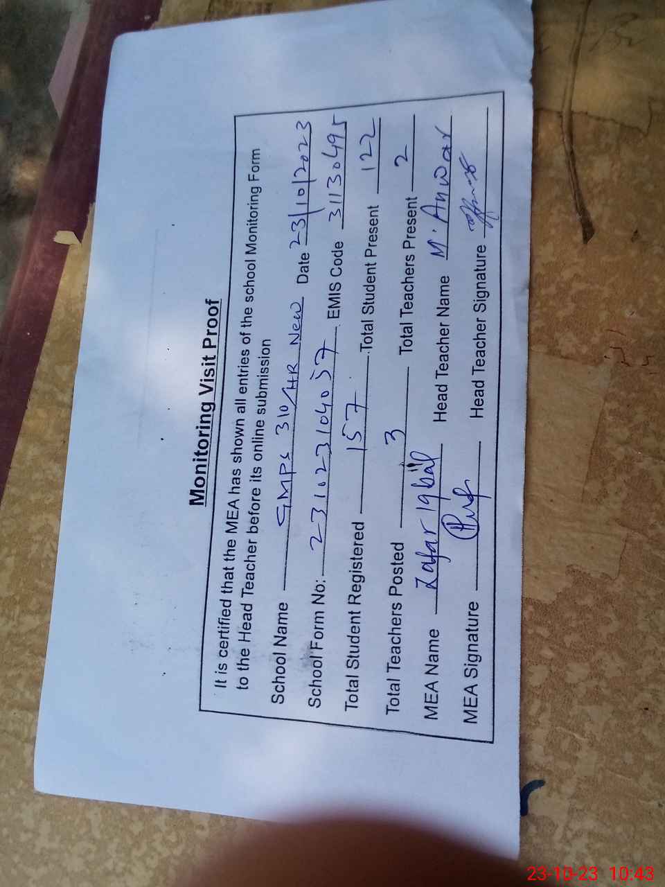 | Attendance Register | Head Teacher | MEA with School | Visit Proof |