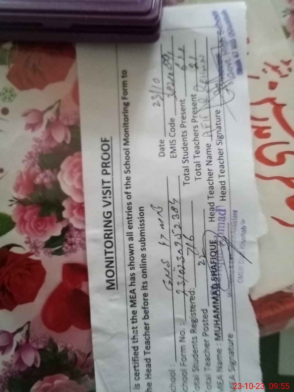| Attendance Register | Head Teacher | MEA with School | Visit Proof |