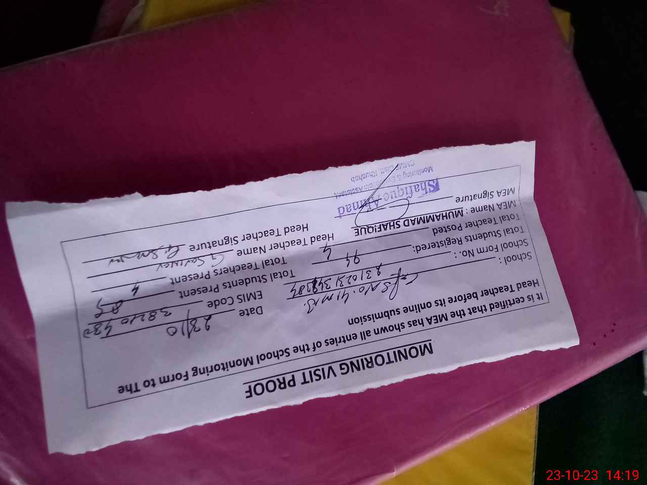| Attendance Register | Head Teacher | MEA with School | Visit Proof |
