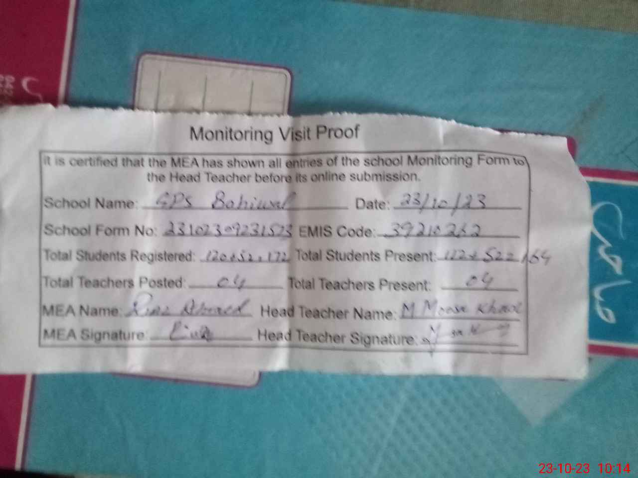 | Attendance Register | Head Teacher | MEA with School | Visit Proof |