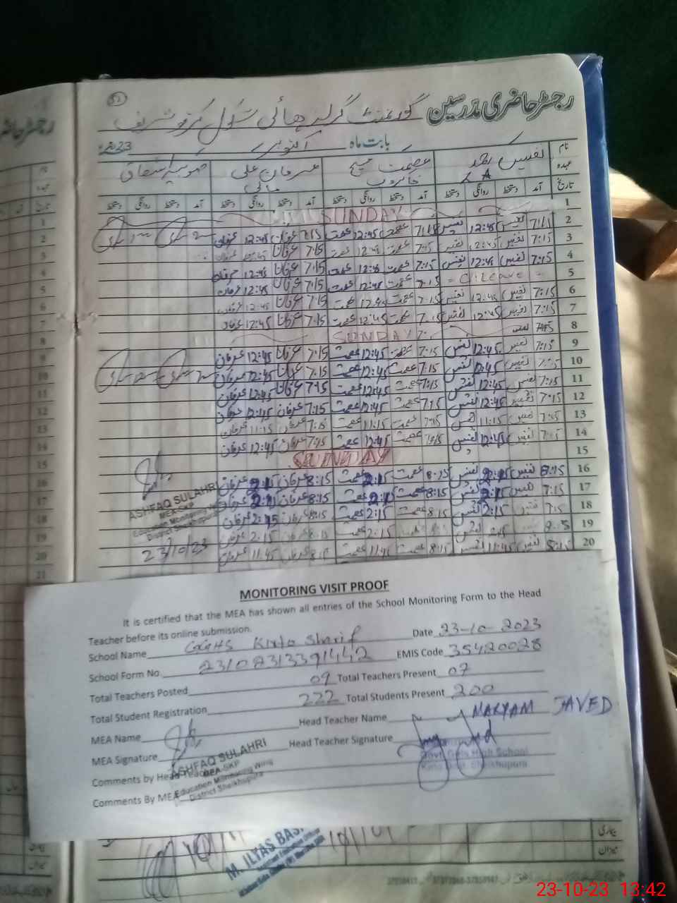 | Attendance Register | Head Teacher | MEA with School | Visit Proof |