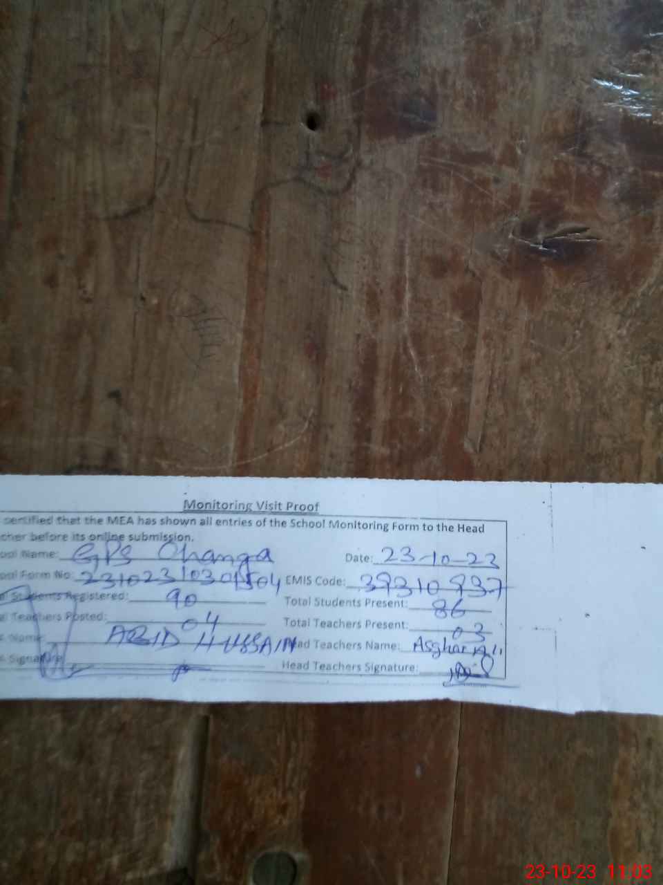 | Attendance Register | Head Teacher | MEA with School | Visit Proof |