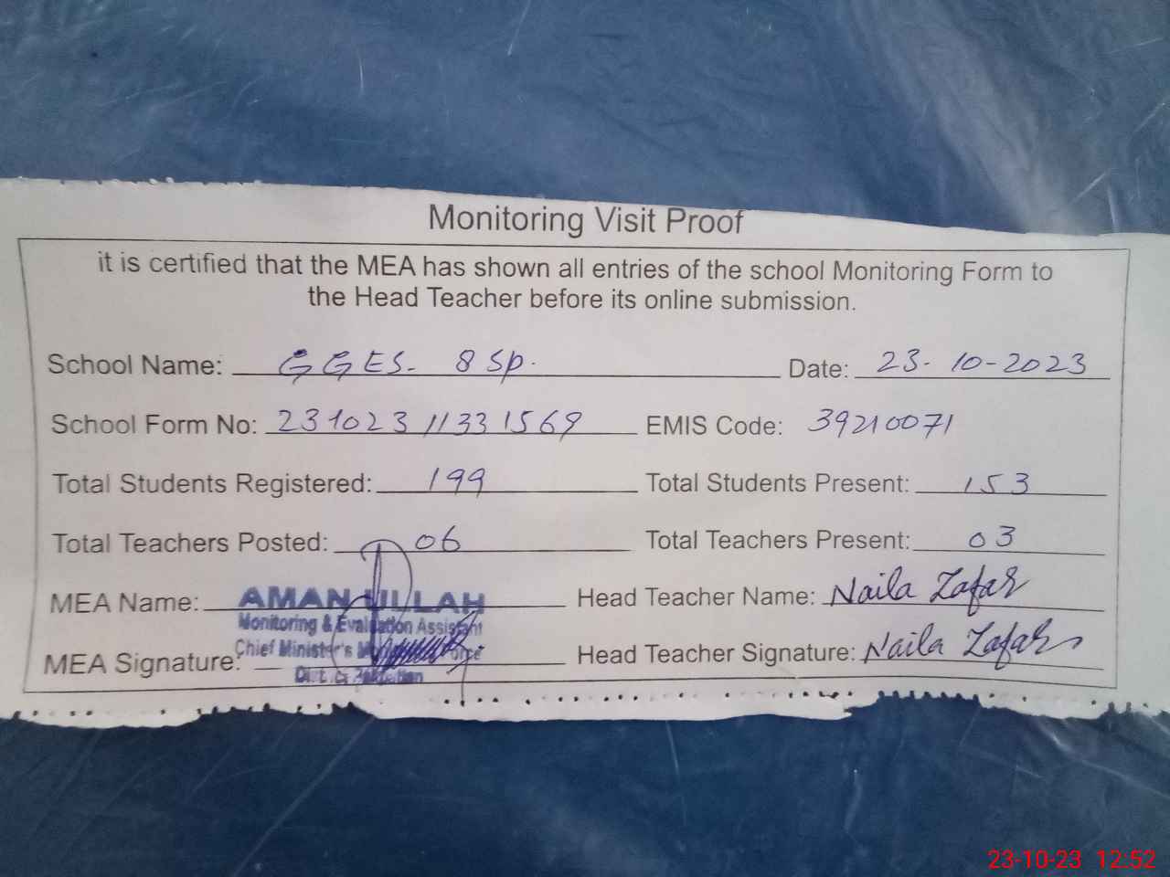 | Attendance Register | Head Teacher | MEA with School | Visit Proof |