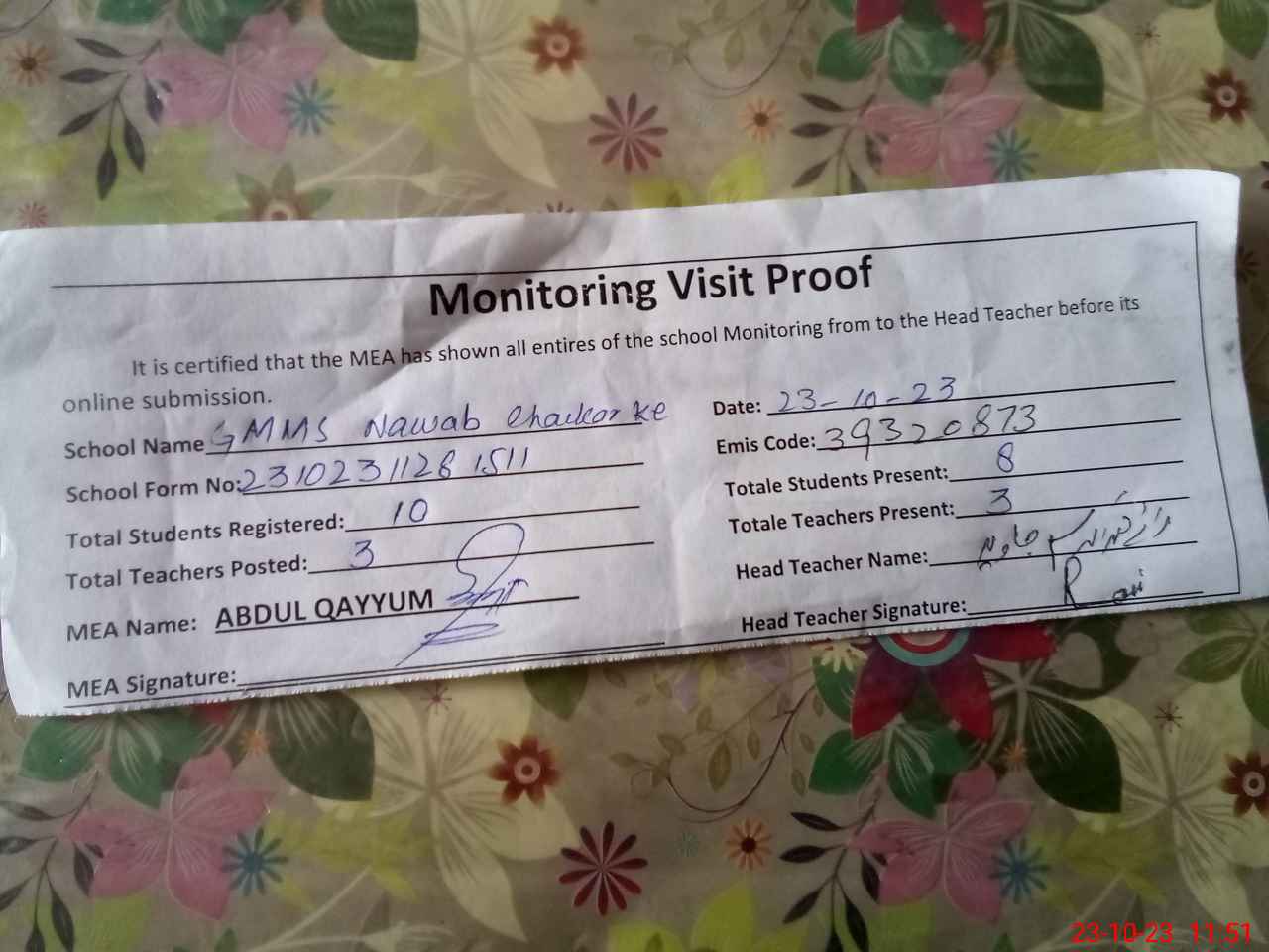 | Attendance Register | Head Teacher | MEA with School | Visit Proof |