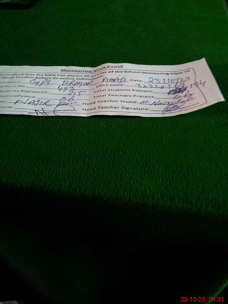 | Monitoring Date: 23-10-2023 | Start Time: 23-10-2023 09:11 AM | End Time: 23-10-2023 09:33 AM | Name of MEA: Na**** Kh**** | |