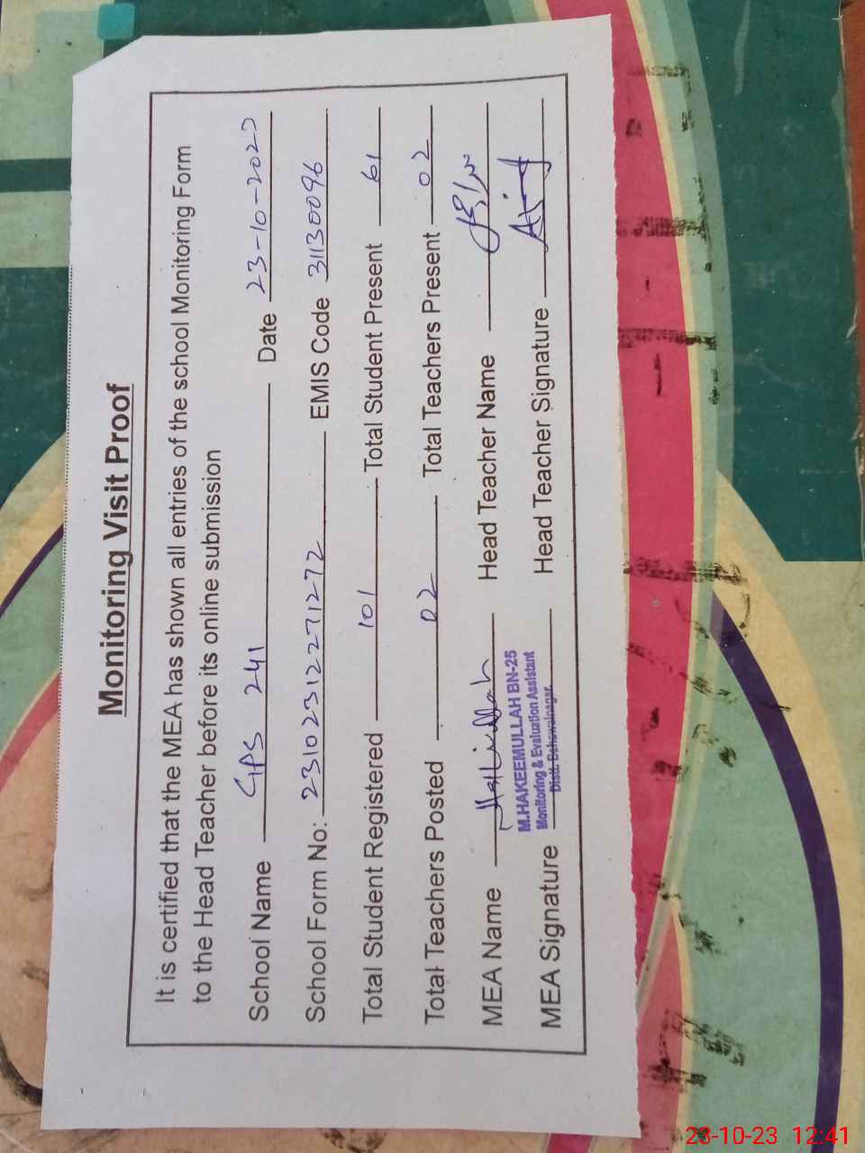 | EMIS Code: 31130096 | Name of School: GPS CHAK NO. 241/HL | |||