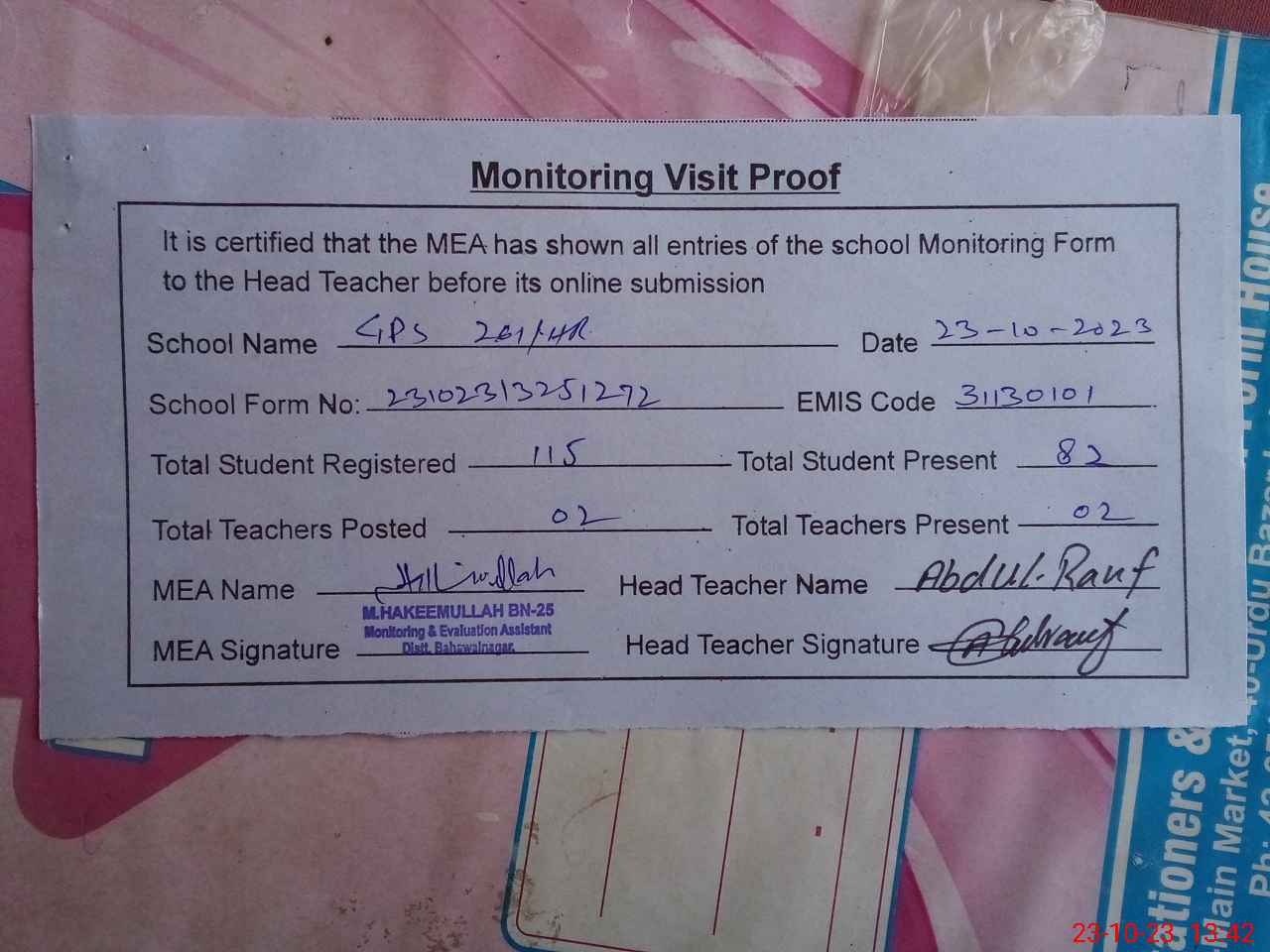 | Attendance Register | Head Teacher | MEA with School | Visit Proof |