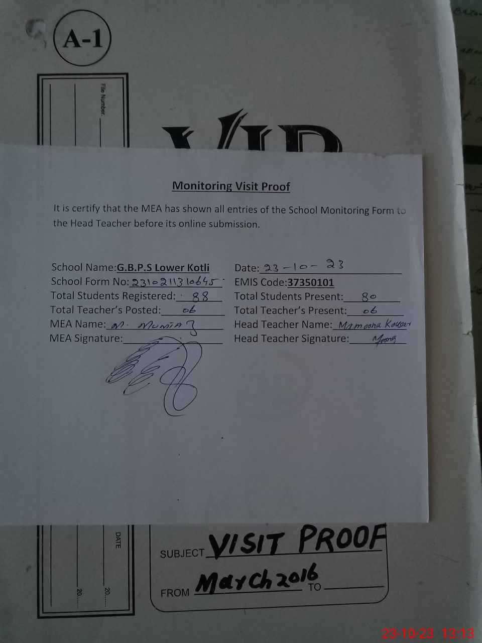 | Attendance Register | Head Teacher | MEA with School | Visit Proof |