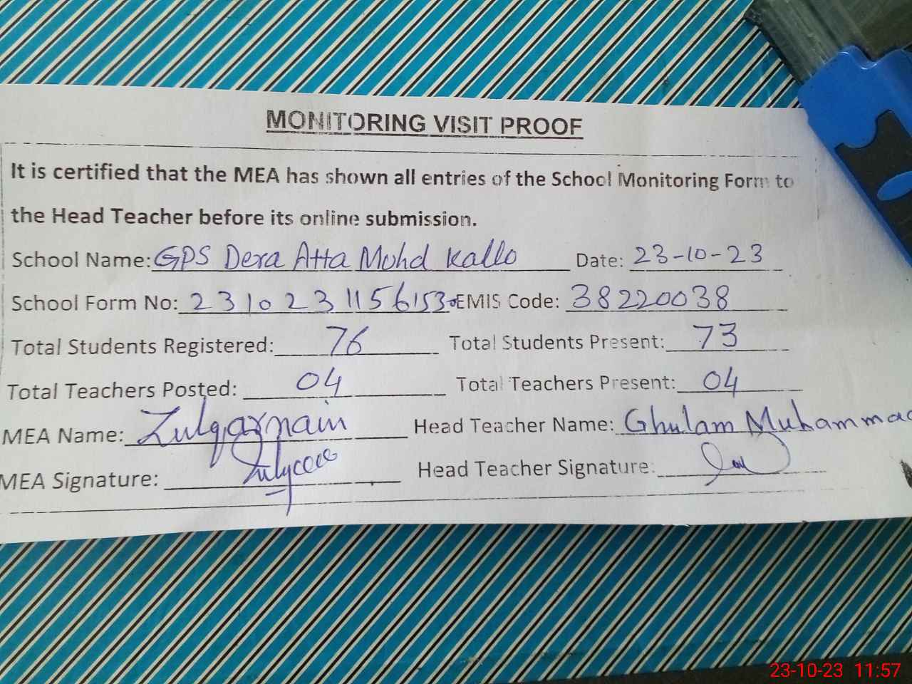 | EMIS Code: 38220038 | Name of School: GPS DERA ATTA MUHAMMAD KALOO | |||