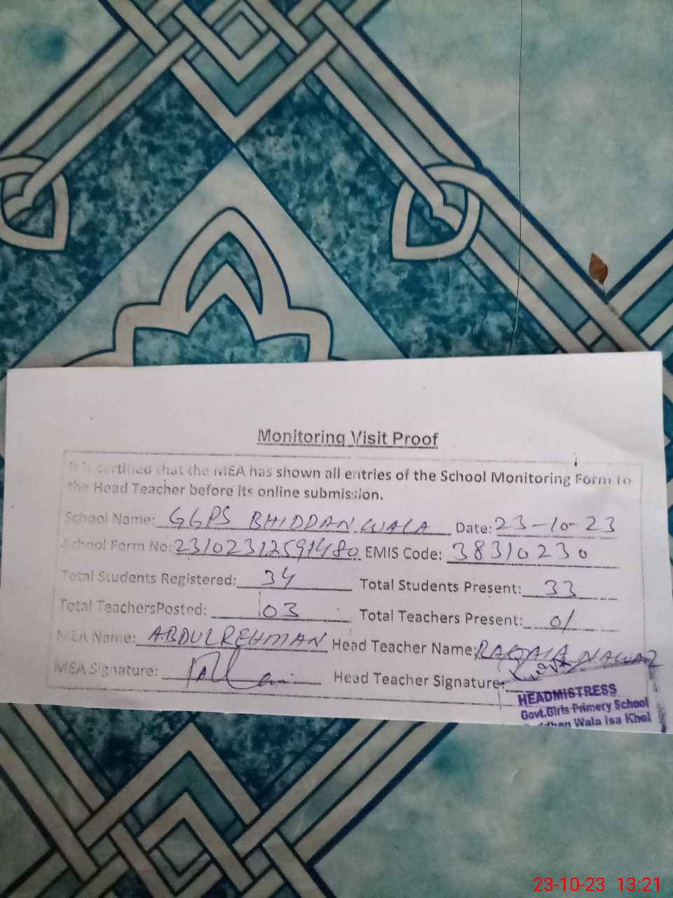 | Attendance Register | Head Teacher | MEA with School | Visit Proof |