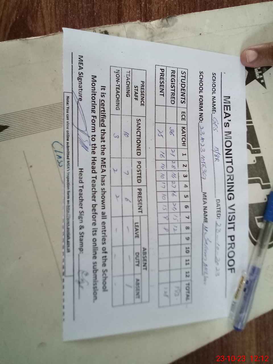 | Attendance Register | Head Teacher | MEA with School | Visit Proof |