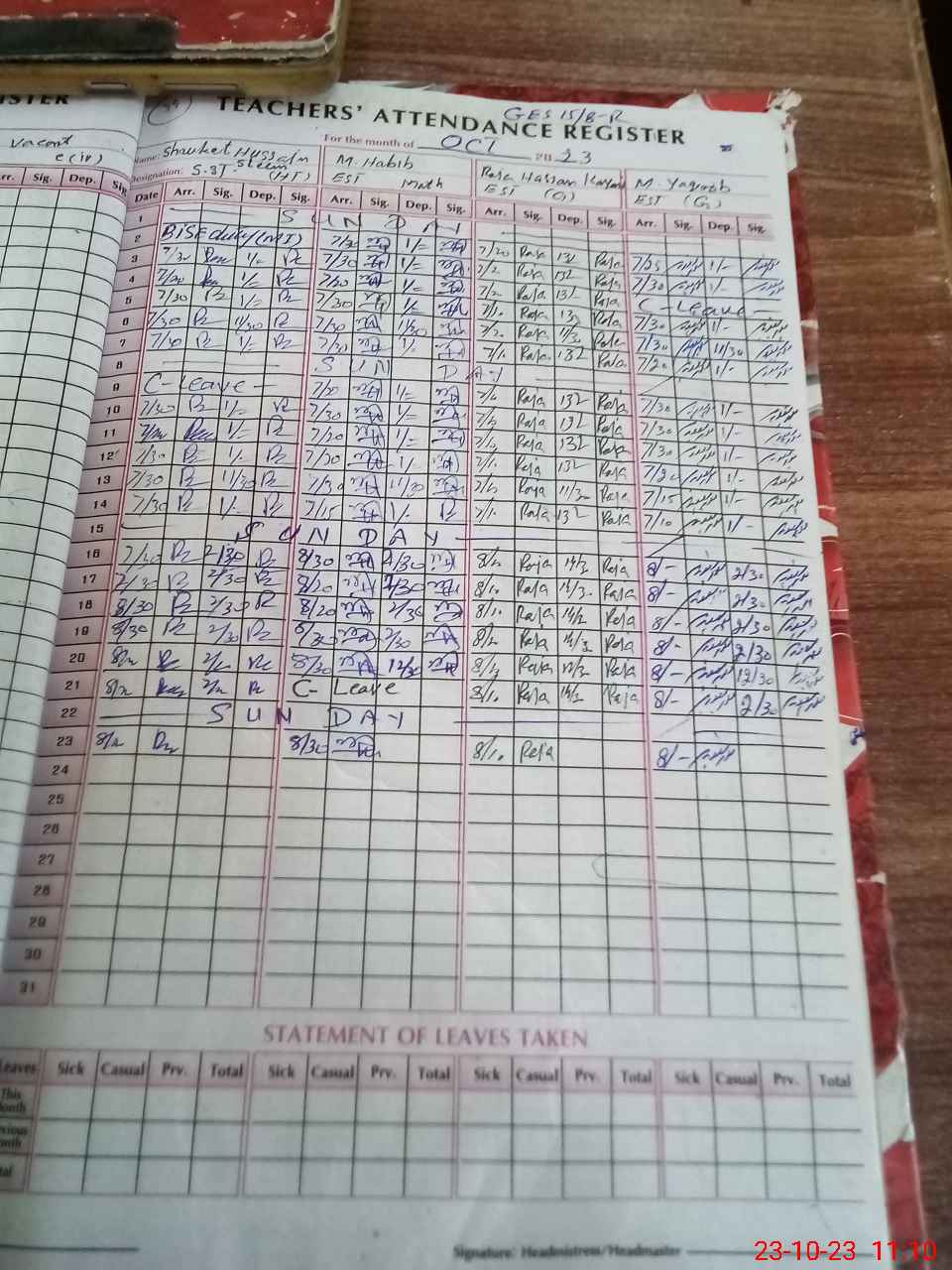 | CNIC | Full Name | Designation | R/C | Absence During Last Calender Month |