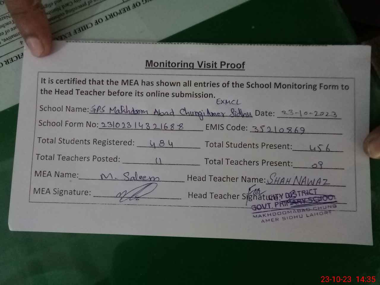 | EMIS Code: 35210869 | Name of School: GPS MAKHDOOM ABAD CHUNGI AMER SIDHU (EX-MCL) | |||