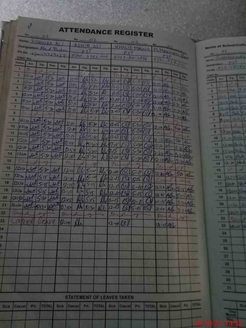 | CNIC | Full Name | Designation | R/C | Absence During Last Calender Month |