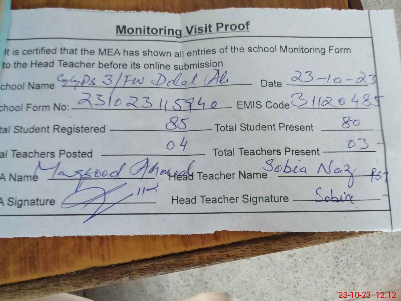 | EMIS Code: 31120485 | Name of School: GGPS CHAK 3 FW DOLAT ALI | |||