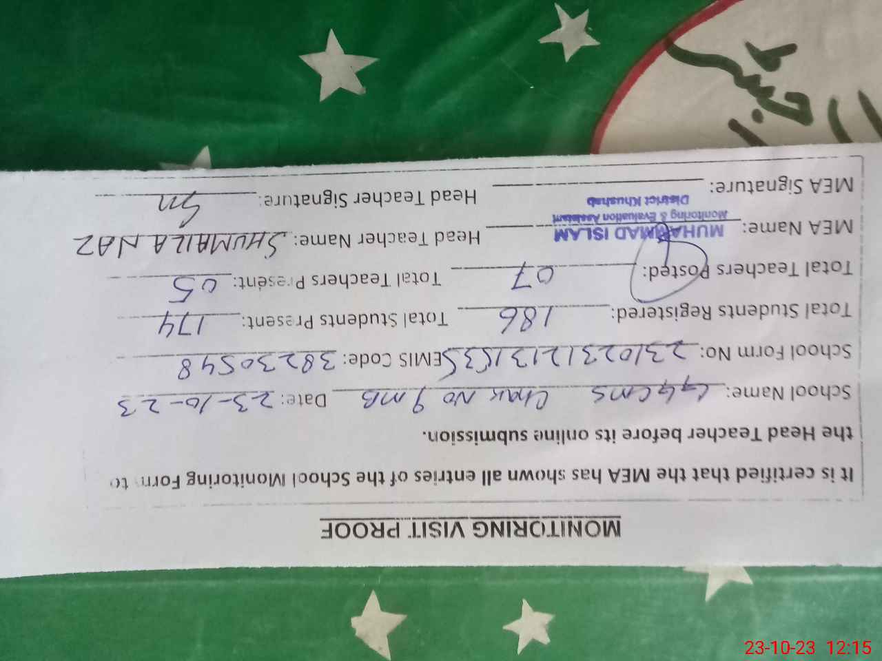 | Certified that this School was Inspected by the Undersigned MEA/DMO Today and the Information Stated Above is as Per Record. | |||||