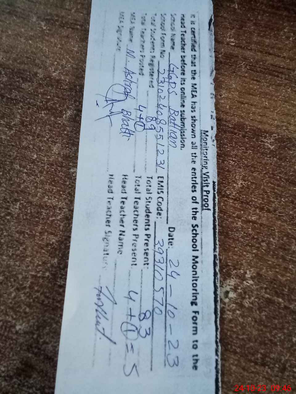 | Attendance Register | Head Teacher | MEA with School | Visit Proof |