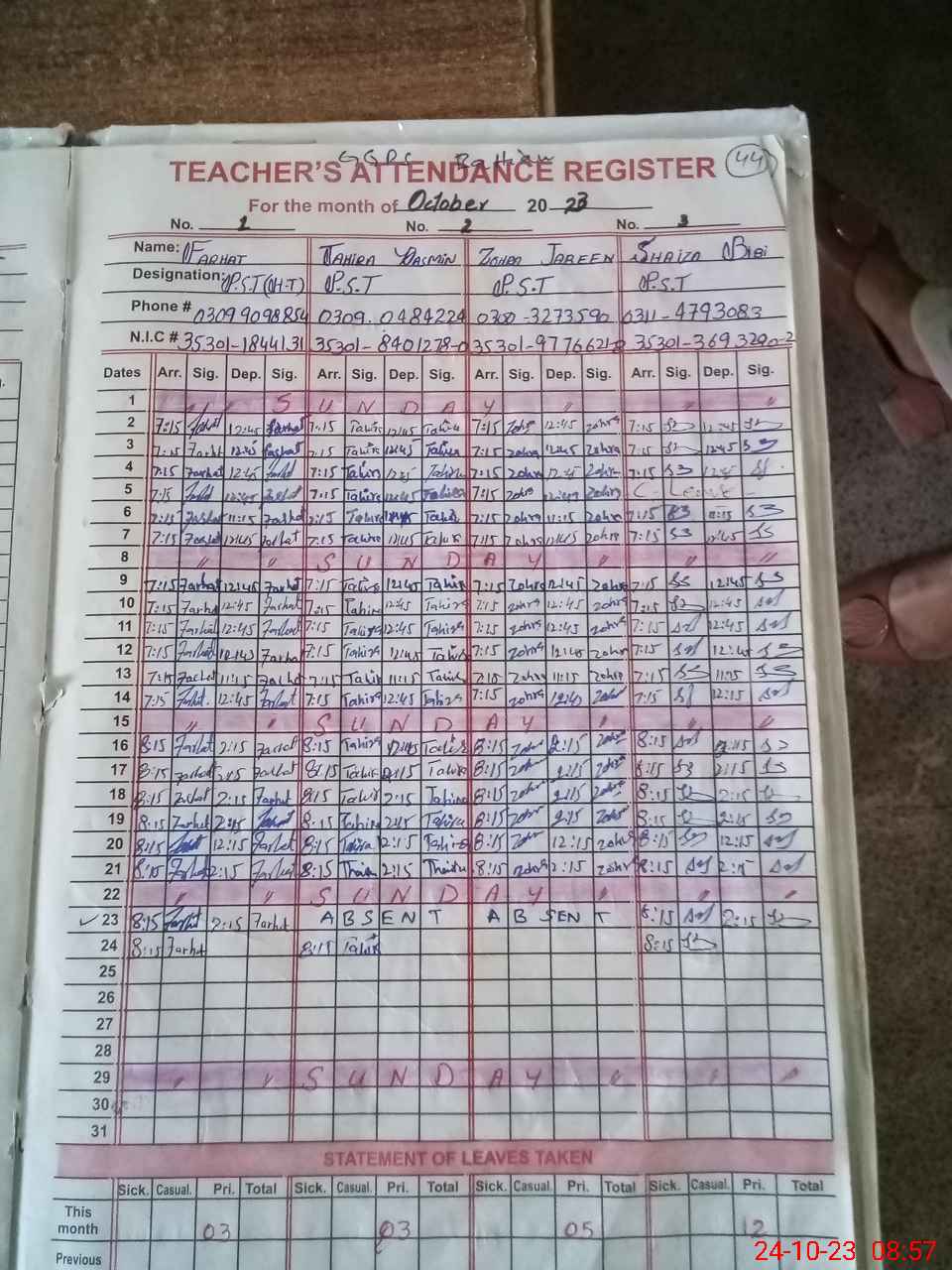 | CNIC | Full Name | Designation | R/C | Absence During Last Calender Month |