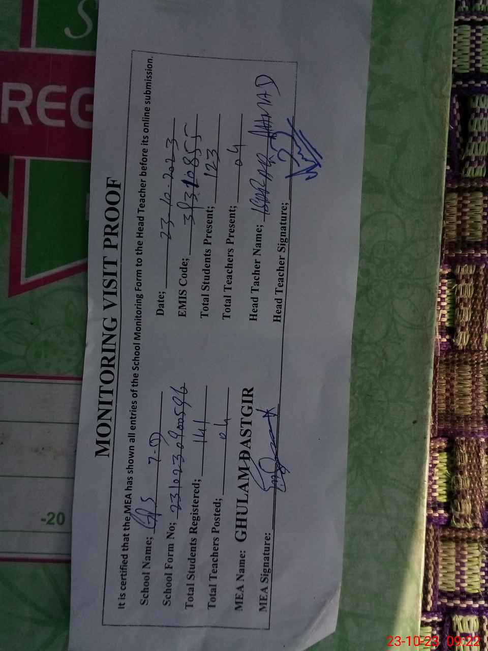 | Attendance Register | Head Teacher | MEA with School | Visit Proof |