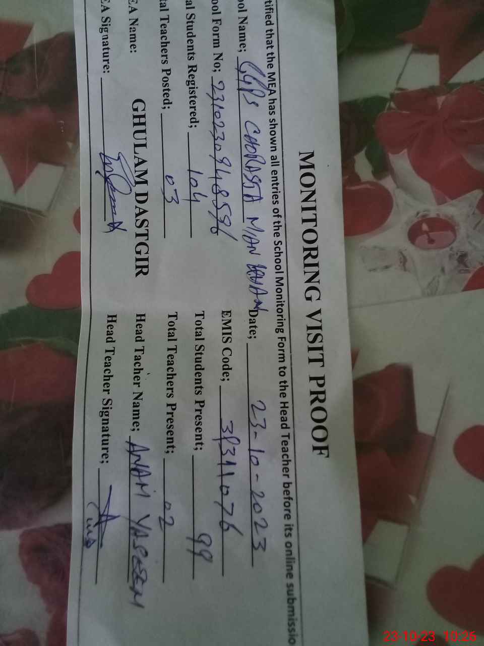 | Attendance Register | Head Teacher | MEA with School | Visit Proof |