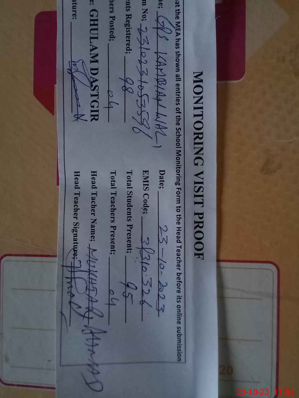 | Attendance Register | Head Teacher | MEA with School | Visit Proof |