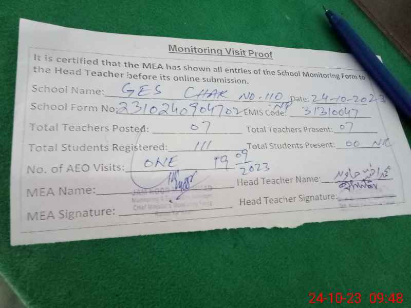 | EMIS Code: 31310047 | Name of School: GES CHAK NO 110/NP S | |||