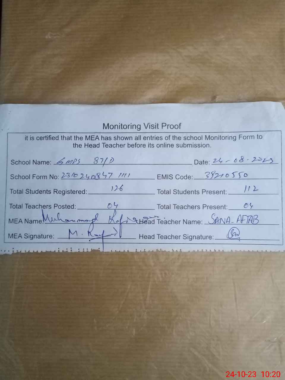 | Attendance Register | Head Teacher | MEA with School | Visit Proof |