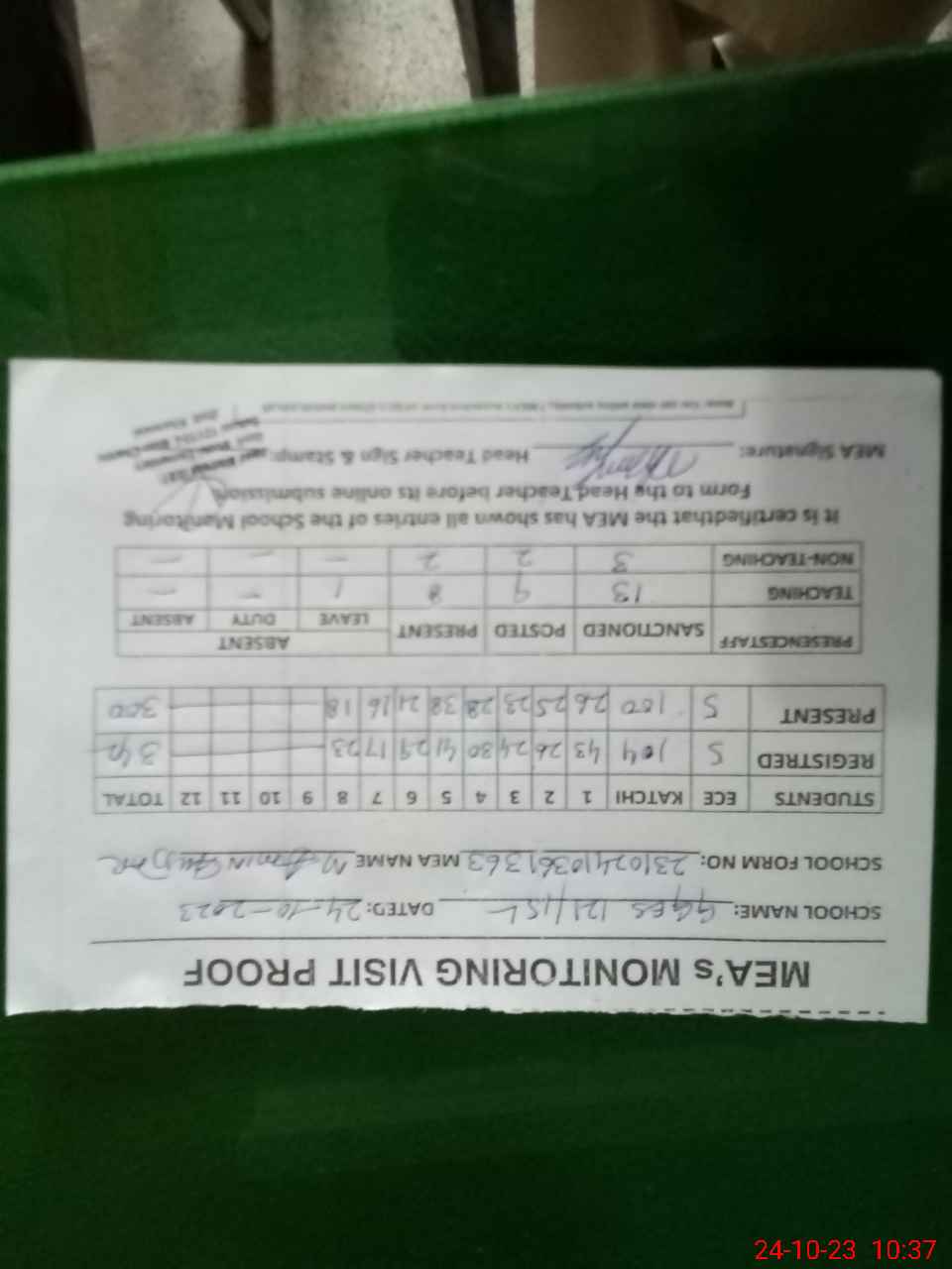 | Attendance Register | Head Teacher | MEA with School | Visit Proof |