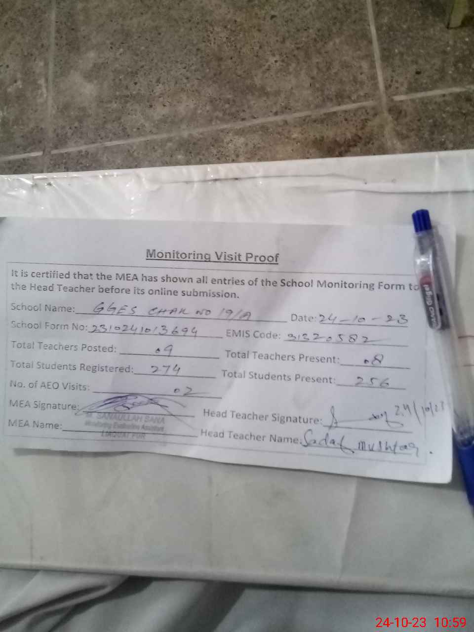 | EMIS Code: 31320582 | Name of School: GGES CHAK NO.19/A | |||