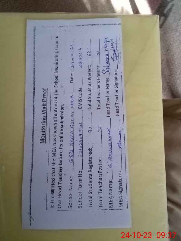 | Certified that this School was Inspected by the Undersigned MEA/DMO Today and the Information Stated Above is as Per Record. | |||||