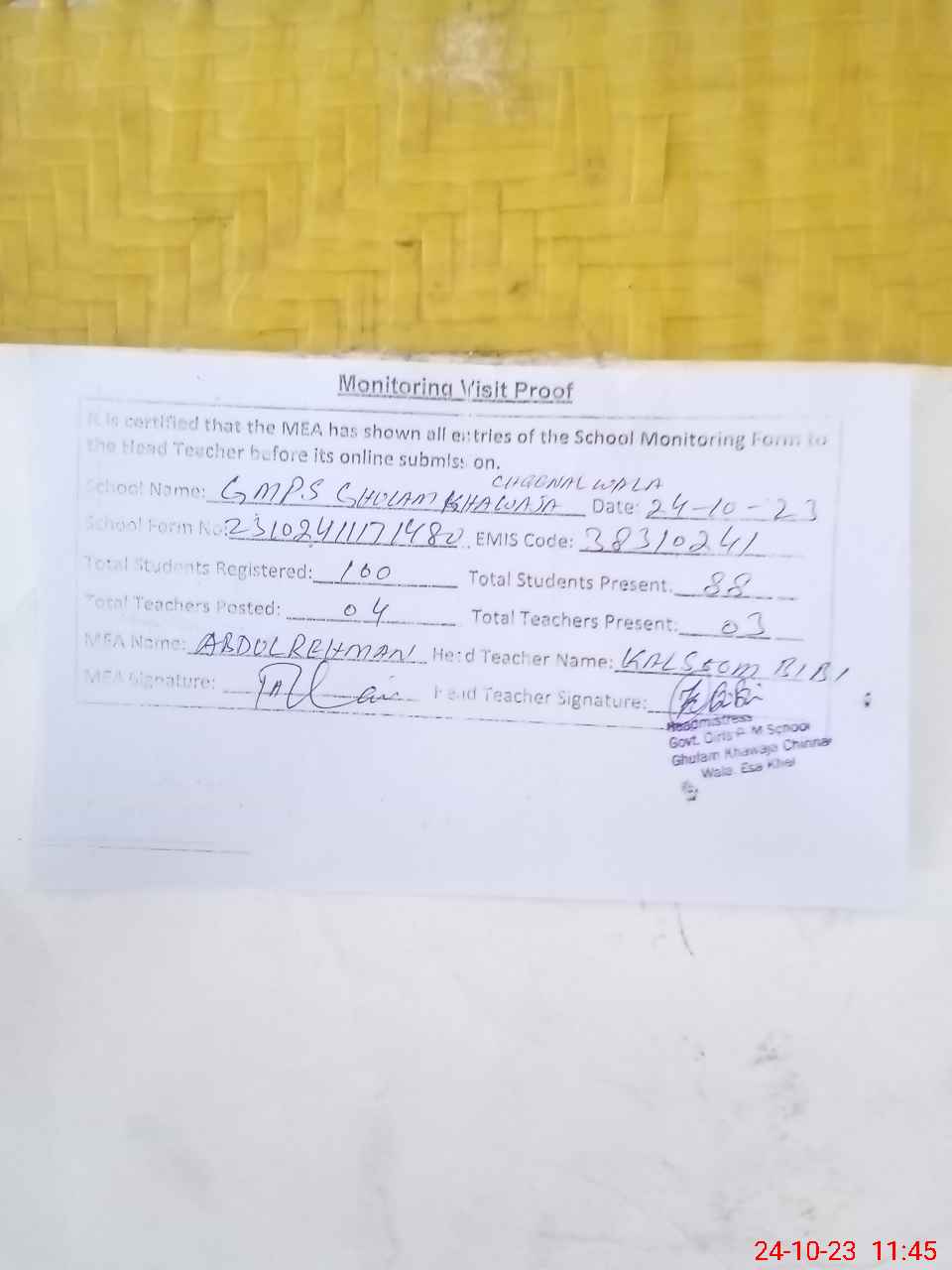| Attendance Register | Head Teacher | MEA with School | Visit Proof |
