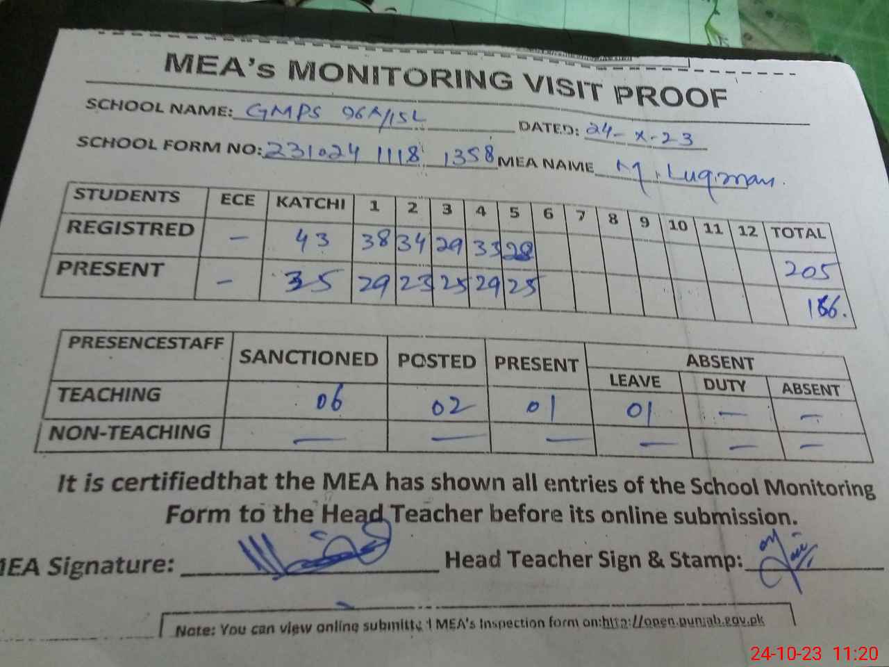 | Attendance Register | Head Teacher | MEA with School | Visit Proof |