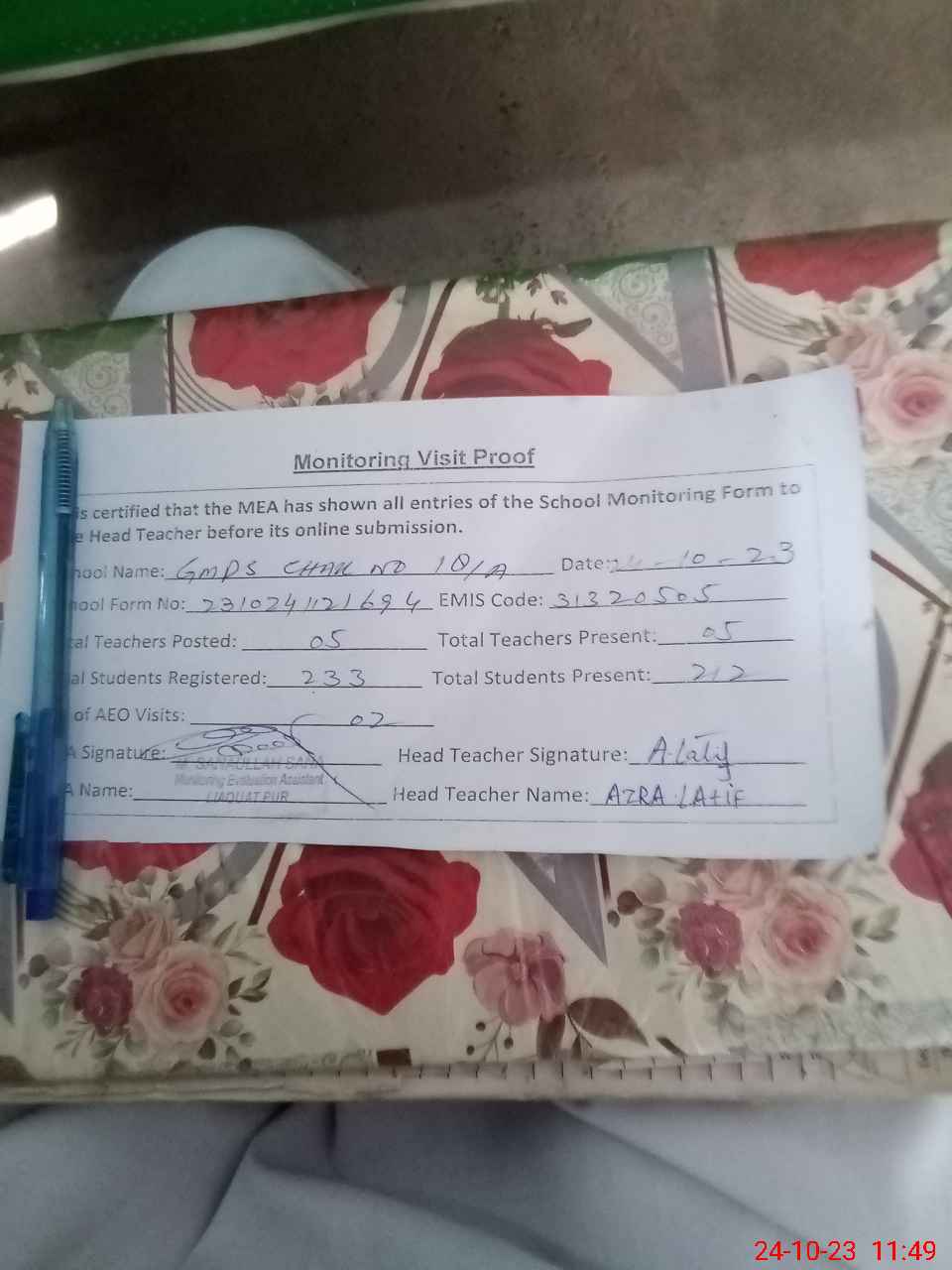 | Attendance Register | Head Teacher | MEA with School | Visit Proof |