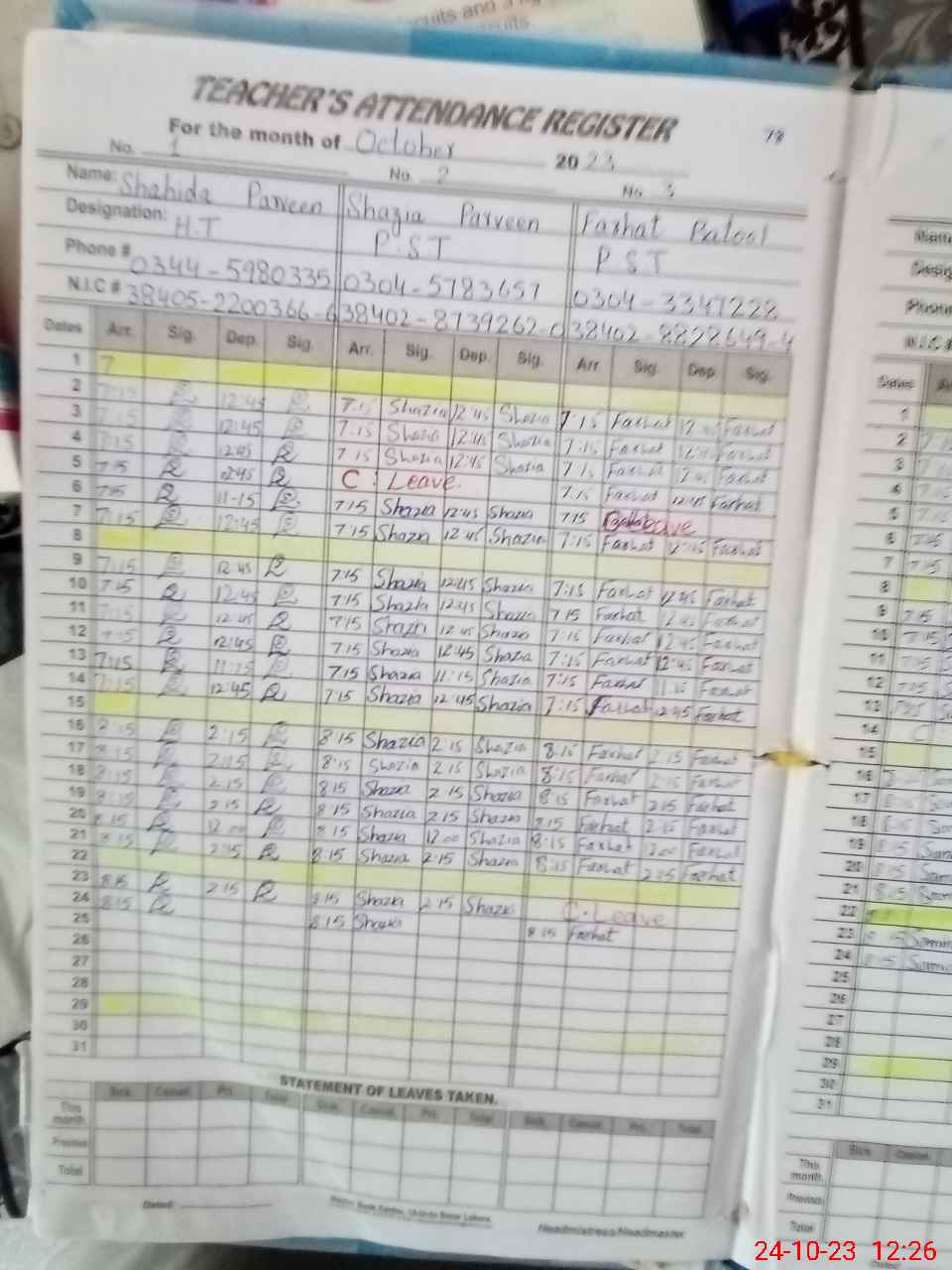 | CNIC | Full Name | Designation | R/C | Absence During Last Calender Month |
