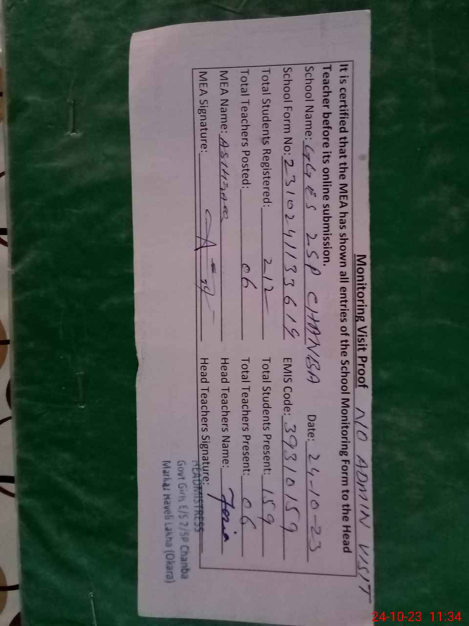 | Certified that this School was Inspected by the Undersigned MEA/DMO Today and the Information Stated Above is as Per Record. | |||||