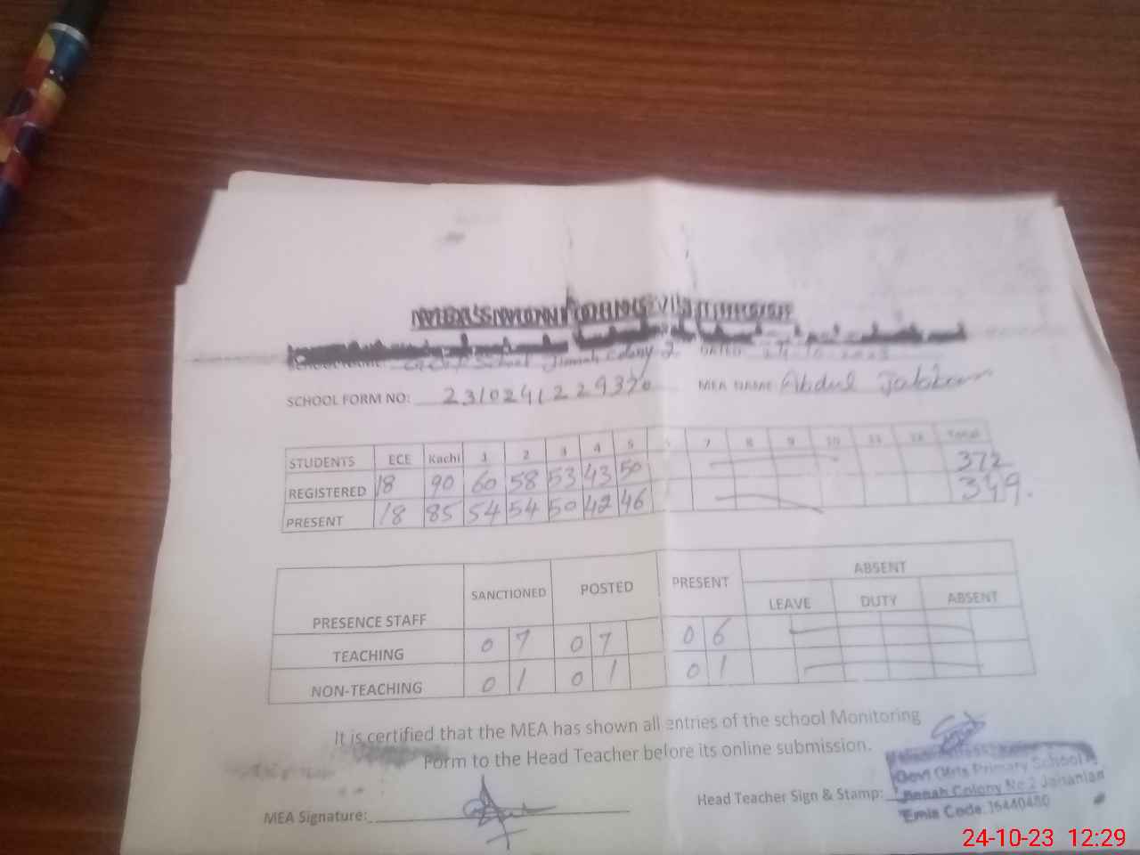 | Attendance Register | Head Teacher | MEA with School | Visit Proof |