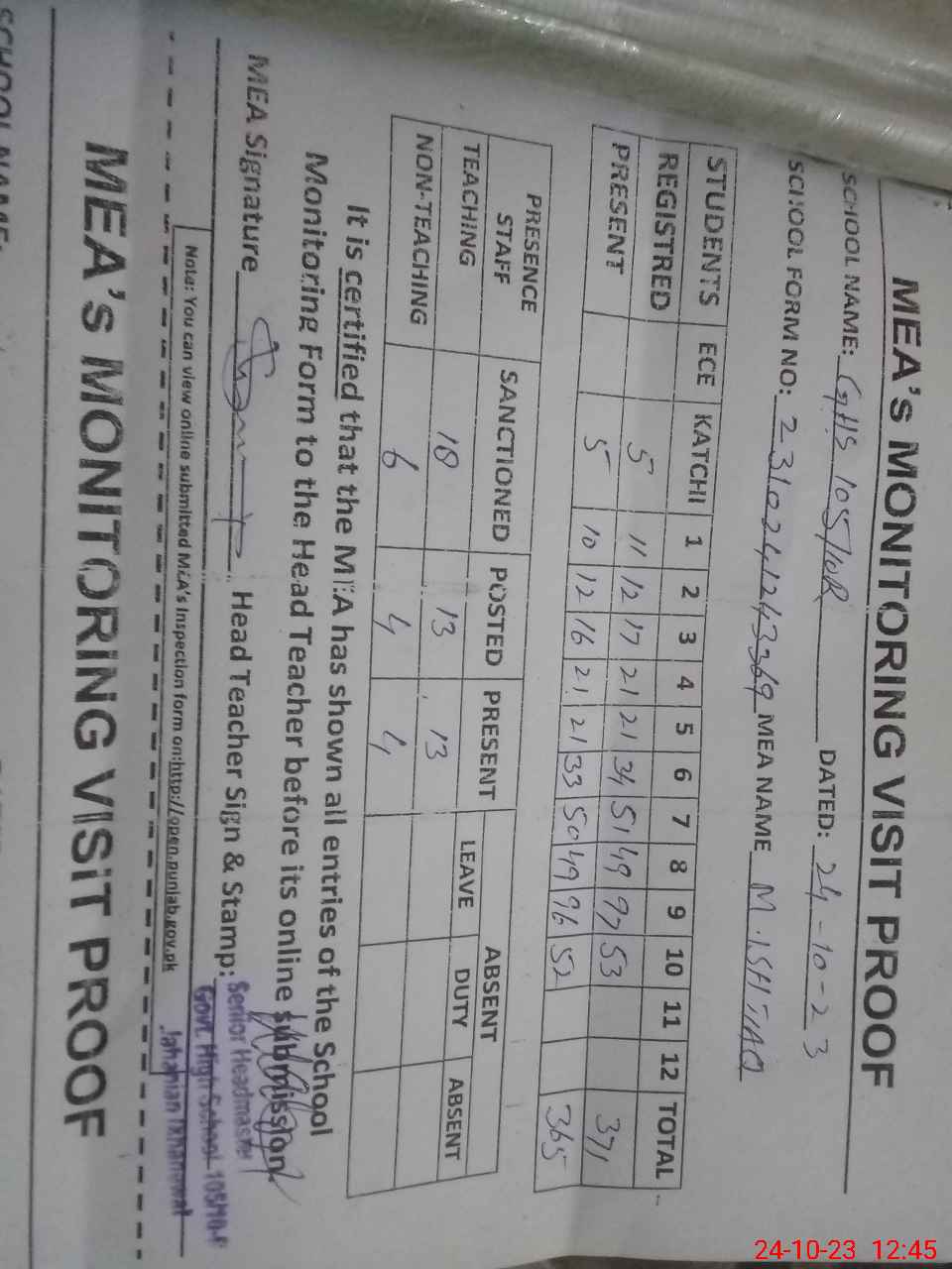 | Attendance Register | Head Teacher | MEA with School | Visit Proof |