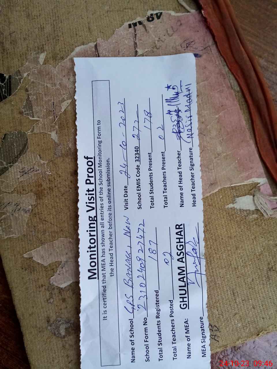| Attendance Register | Head Teacher | MEA with School | Visit Proof |