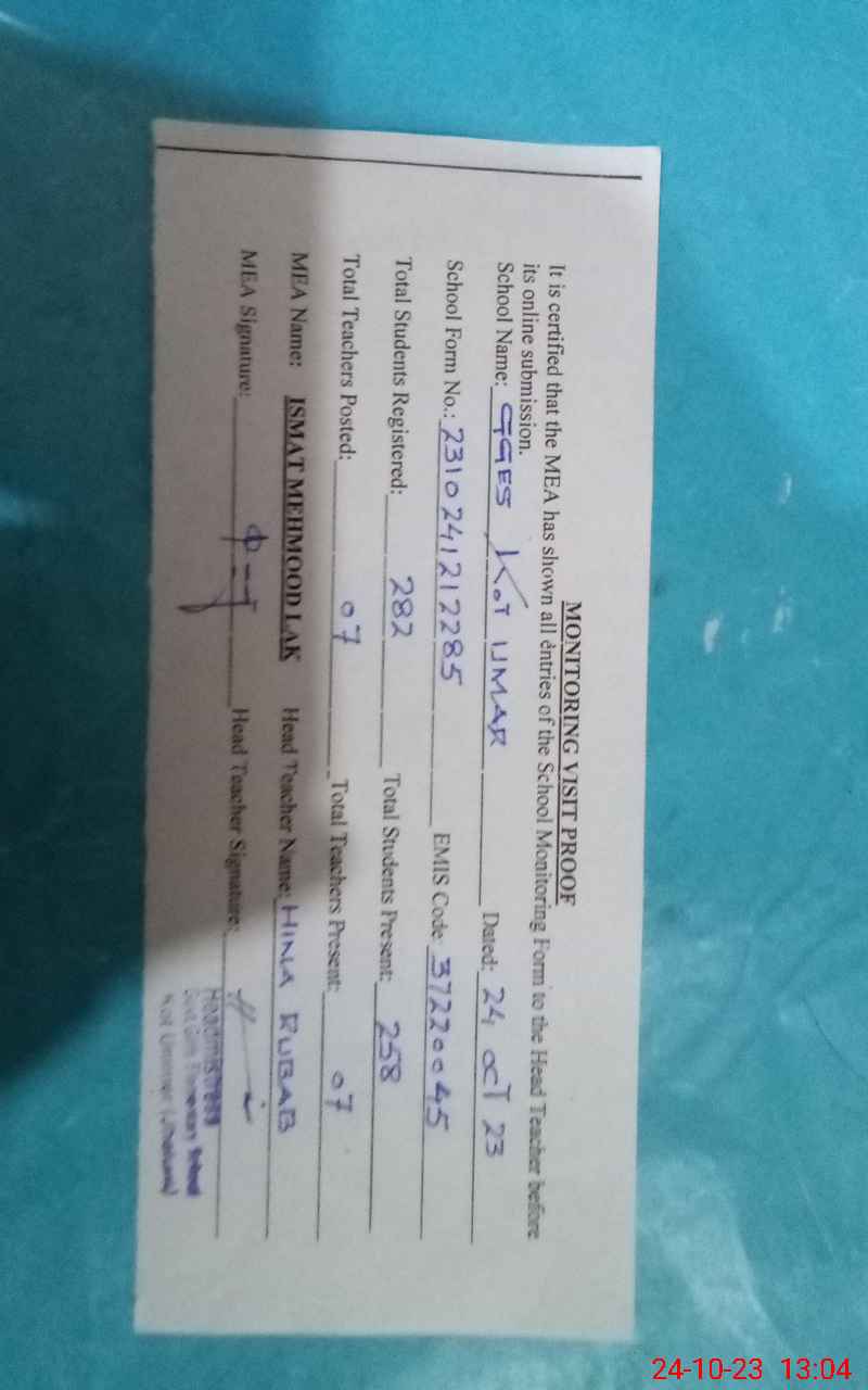 | EMIS Code: 37220045 | Name of School: GGES KOT UMMAR | |||