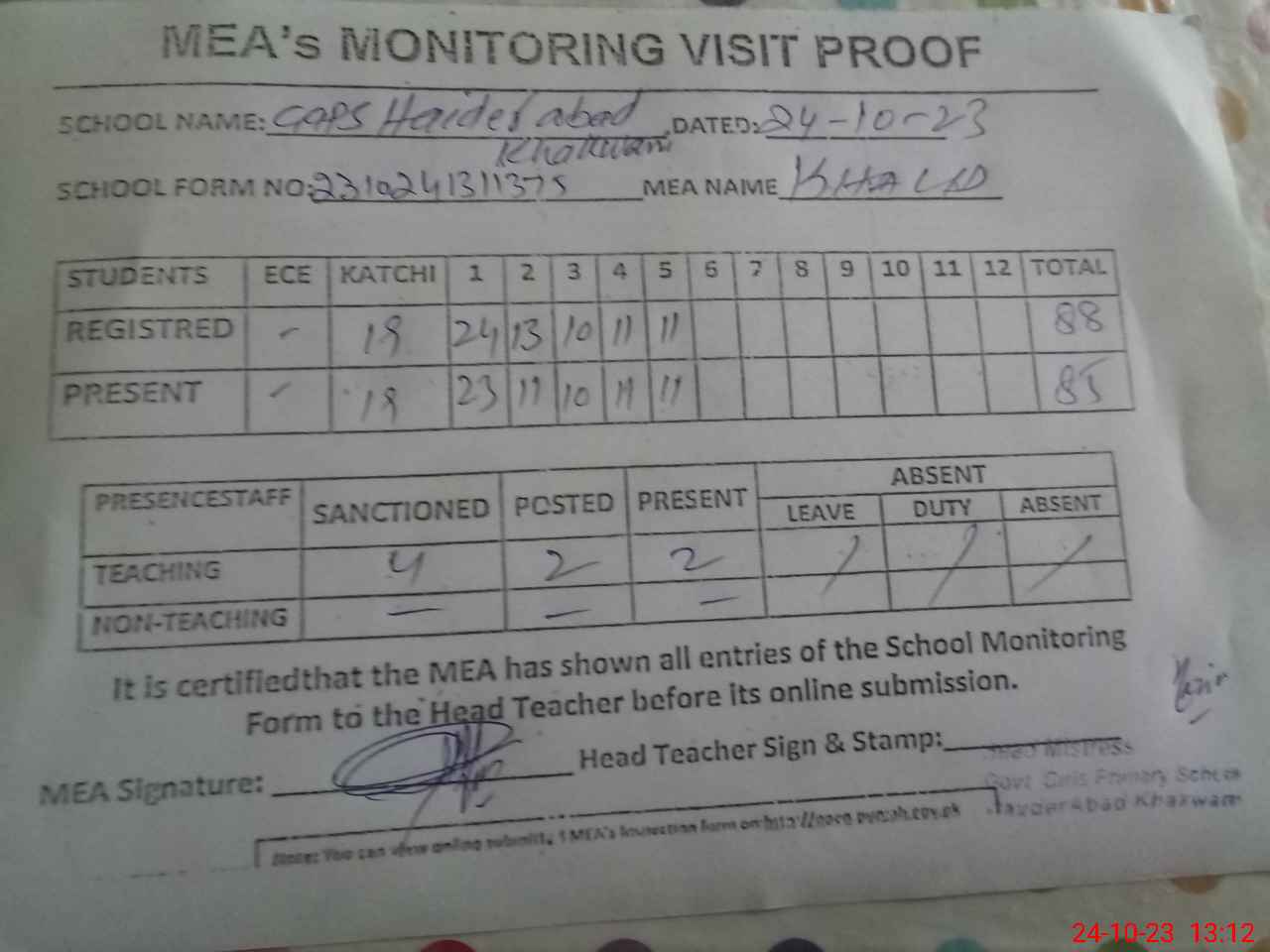 | Attendance Register | Head Teacher | MEA with School | Visit Proof |