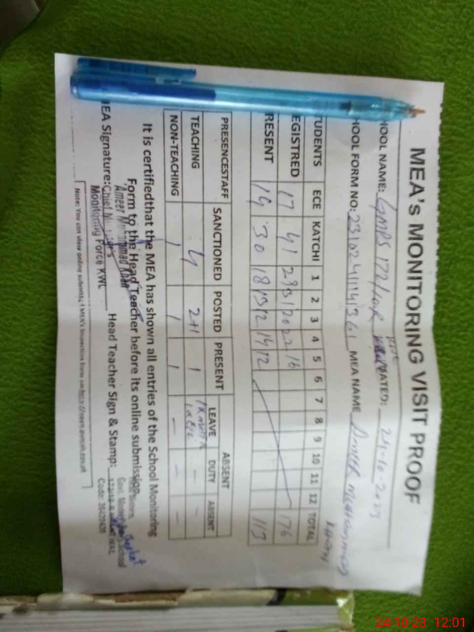 | Attendance Register | Head Teacher | MEA with School | Visit Proof |