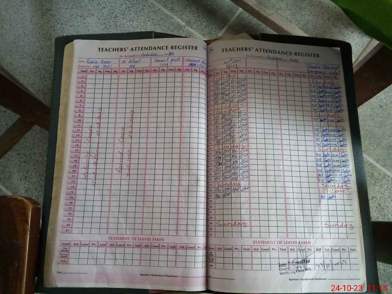 | Leave | Duty | Absent | Maternity | Medical | Ex- Pak |