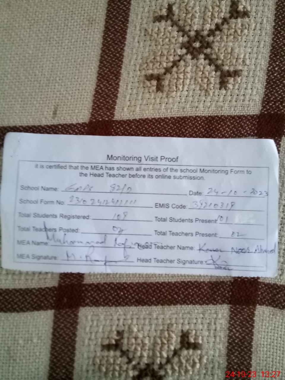 | Certified that this School was Inspected by the Undersigned MEA/DMO Today and the Information Stated Above is as Per Record. | |||||