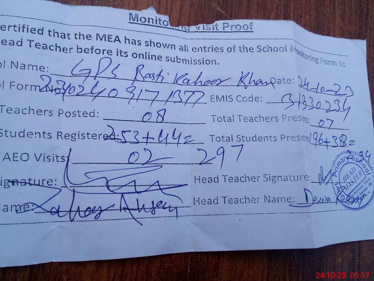 | Attendance Register | Head Teacher | MEA with School | Visit Proof |