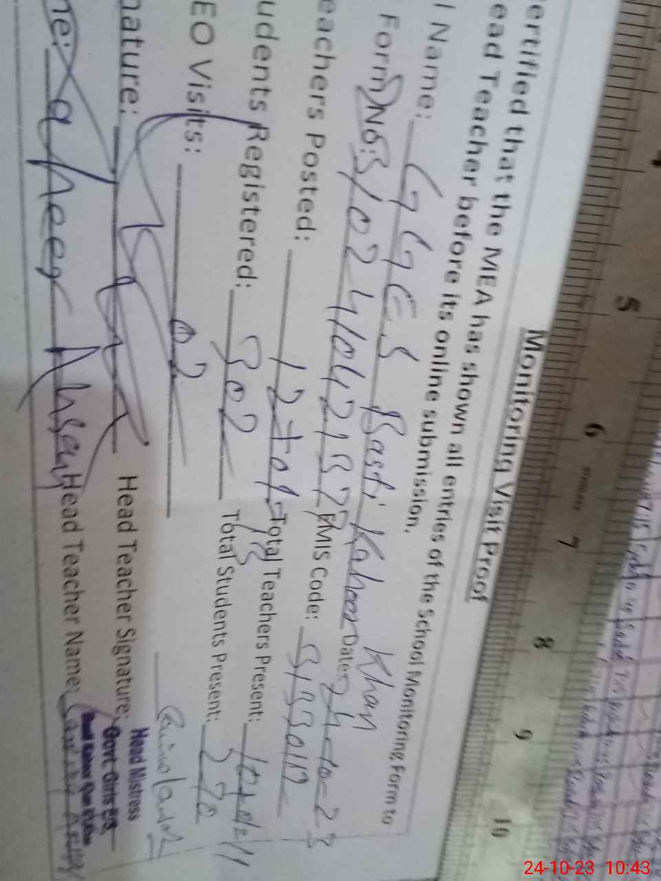 | Name: SA**** KO**** Designation: (School Headmaster's/Headmistress's) S.S.T. SCI Phone/Cell Number: 03**** |