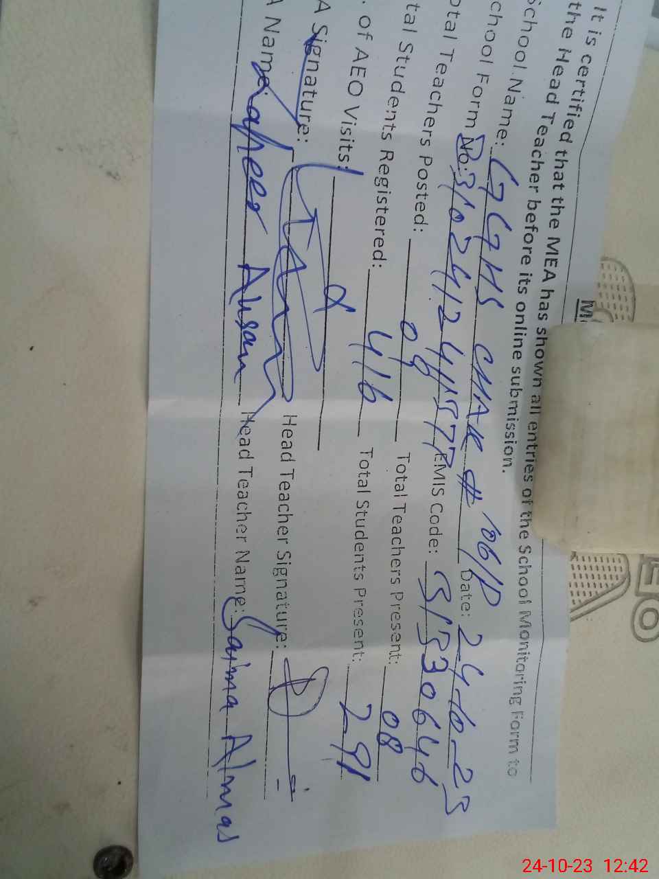 | Name: Sa**** al**** Designation: (School Headmaster's/Headmistress's) SST Phone/Cell Number: 03**** |