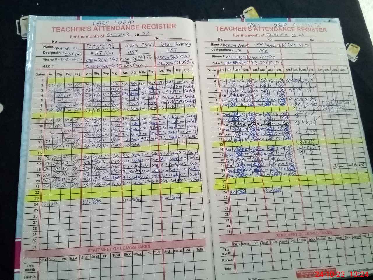| CNIC | Full Name | Designation | R/C | Absence during last cal. month |