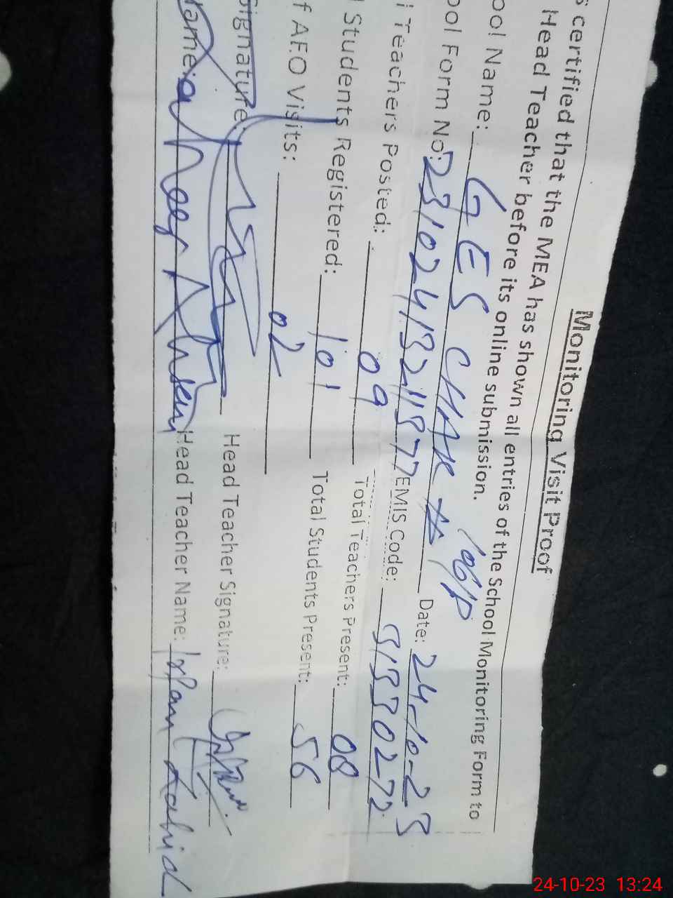 | Monitoring Date: 24-10-2023 | Start Time: 24-10-2023 12:44 PM | End Time: 24-10-2023 01:35 PM | Name of MEA: Za**** Ah**** | |